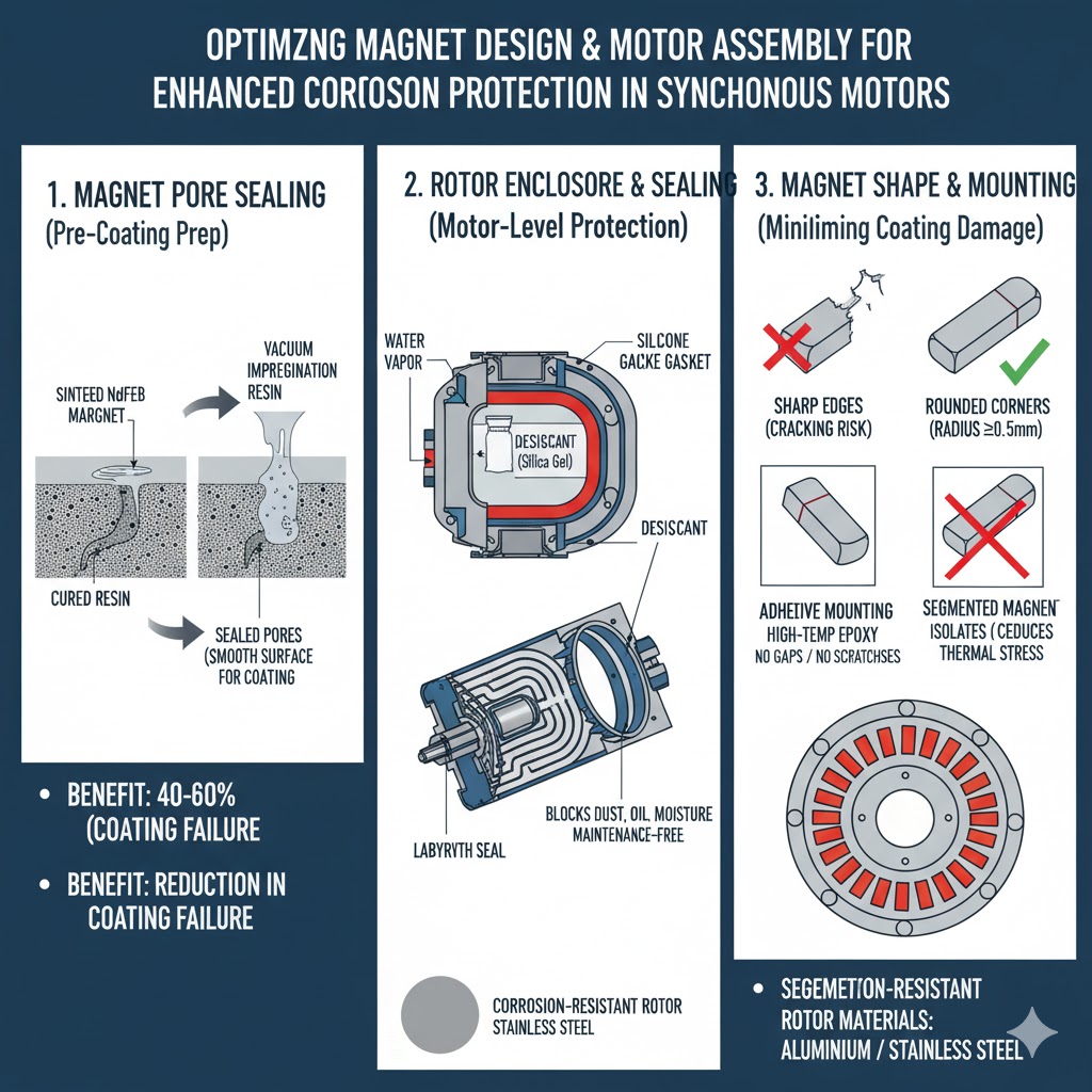 A felületi bevonatok önmagukban nem elegendőek – a mágnes és a motor szerelvényének tervezési megválasztása kritikus szerepet játszik a korróziós kockázat minimalizálásában. Ezek az optimalizálások kiegészítik a bevonatokat és meghosszabbítják a mágnes élettartamát:
