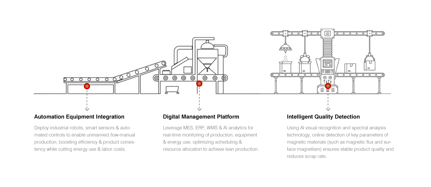A Jinlun Magnet az olyan nemzetközi rendszerek által tanúsított intelligens gyártási rendszeren keresztül, mint az IATF16949 és az ISO9001/14001, valamint olyan rendszerszoftverekkel kombinálva, mint az ERP, MES és WMS, a teljes folyamat minőségének nyomon követhetőségét értük el a nyersanyagoktól a késztermékekig. Miközben biztosítjuk a termékminőséget, a folyamatinnováció révén továbbra is csökkentjük a termelési költségeket, és az ipari szabványoknál magasabb költséghatékony megoldásokat kínálunk ügyfeleinknek.